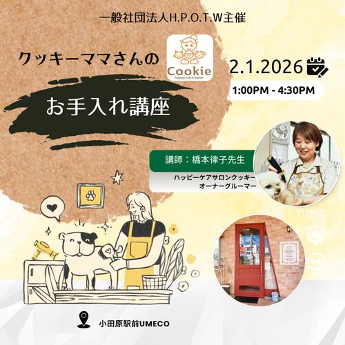 ベテラン敏腕グルーマー犬にとことん優しい主義を追求、施術されるクッキーママさんにお手入れ全般を教えていただく講座を企画しました。プロのグルーマーさんもぜひー。 eventpay.jp 開催日:2026年2月1日(日) 時間:13:00~16:30 受付開始:午前12時30分…